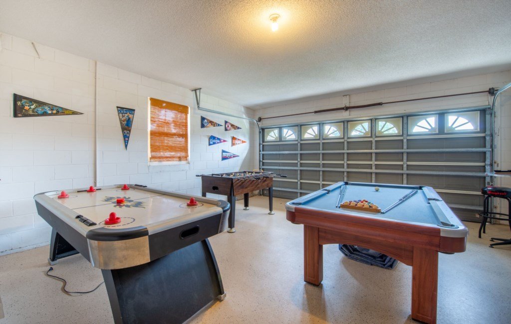A pool table and air hockey are provided for guests use in the garage.