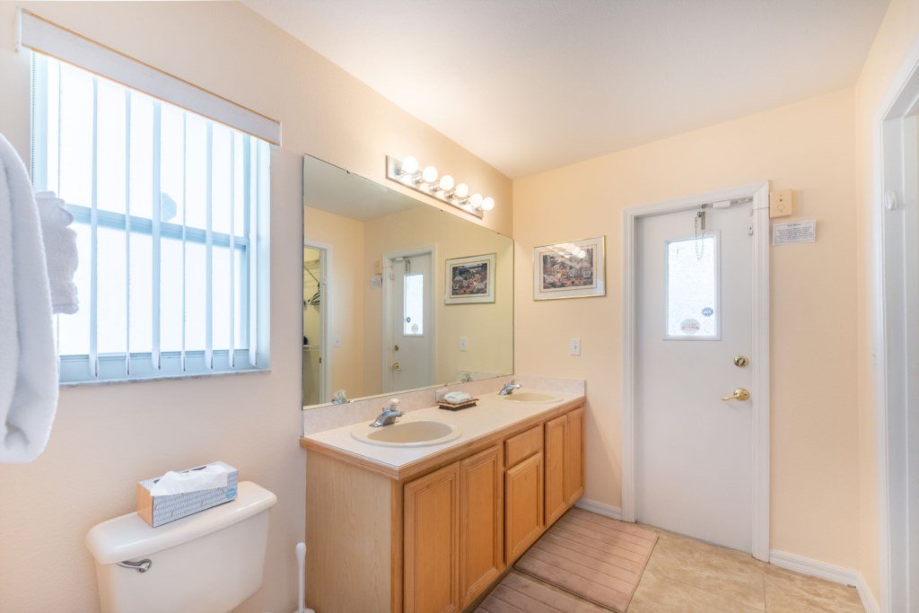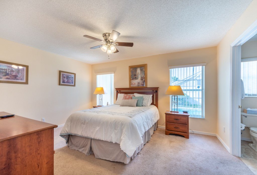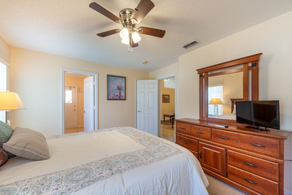 The Master Bedroom has a queen-size bed with a Sealy Posturepedic Pillow Top mattress, two nightstands, full-size dresser with mirror, radio alarm clock and walk-in closet. There is a ceiling fan, a 21″ widescreen LCD remote control colour TV with Roku stick, telephone, and en-suite bathroom with, shower, toilet and twin hand basins. A hairdryer is provided in the bathroom. A door leads out from the bathroom on to the pool deck.